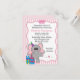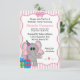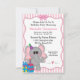 Convite de aniversário de Elefante Rosa para Crianças. Este convite de aniversário traz um elefante bonito vestindo um chapéu de festa. O fundo é uma faixa cor-de-rosa com um arco rosa e um coração cor-de-rosa.