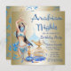 Noites árabes convites de festas de aniversários com belas ilustrações azuis e douradas sobre fundo dourado. Esta maravilhosa festa de aniversário da noite árabe e este convite para eventos é facilmente personalizado para o seu evento simplesmente adicionando os seus detalhes. Este é um design impresso sem brilho real, folha de alumínio, etc.