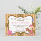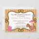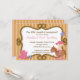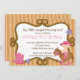 Enfie sua festa de aniversário pequena doce das vaqueiras fora do direito com nosso convite bonito do aniversário de criança da vaqueira do bebê que caracteriza uma vaqueira do bebê que monta um cavalo de balanço que veste uma fralda cor-de-rosa, as botas de vaqueiro e o chapéu de vaqueiro ajustados em um fundo marrom da listra. Bonito para uma festa de aniversário ocidental para o primeiro aniversário de um bebê. Visite nossa loja para ver o outro obrigado bonito dos convites de festas de aniversários & da harmonização você notas, etiquetas & selos postais. Ilustrações do © JW