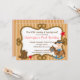 Enfie sua festa de aniversário pequena doce do vaqueiro fora do direito com nosso convite bonito do aniversário de criança do vaqueiro do bebê que caracteriza um vaqueiro do bebê que monta um cavalo de balanço que veste uma fralda azul, as botas de vaqueiro e o chapéu de vaqueiro ajustados em um fundo marrom da listra. Bonito para uma festa de aniversário ocidental para o primeiro aniversário de um bebê. Visite nossa loja para ver o outro obrigado bonito dos convites de festas de aniversários & da harmonização você notas, etiquetas & selos postais. Ilustrações do © JW