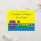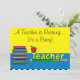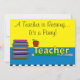 Convites de festas de aposentadoria de professores exclusivos. Fundo amarelo, azul com fundo preto e branco fino na parte inferior. Estaca de livros multicoloridos, lápis, maçã e "Um professor está se aposentando...é um partido!".
