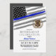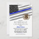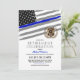 Convites de festas de aposentadoria divertidos com uma bandeira da polícia de aquarela com uma fina linha azul, crachá de cor dourada e coroa de louros, que você pode personalizar para sua próxima celebração.