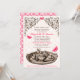 Os Convites de festas de chá de noiva de jardim rosa têm um conjunto de chá e borboletas com um conector de rolagem floral e padrões de ornamentado em cor rosa, marrom e branco.