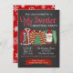 Convite de festas de Natal de suéter feio com três suéteres muito feios num quadro e fundo de flocos de neve. Você pode personalizar facilmente esses convites de festas de Natal de suéter feio e divertido para o seu evento simplesmente adicionando seus detalhes no estilo de fonte e na cor que você prefere.