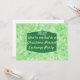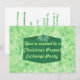 A pintura de um presente verde revestido de um arco listrado verde e branco, sobre um fundo com padrão abstrato de amarelo, verde e branco, é impressa em convites personalizados. O texto pode ser facilmente personalizado para uma festa de presente de Natal, e também pode ser personalizado de forma diferente ou excluído.