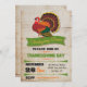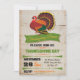convites de festas bonito e rústicos do Dia de Ação de Graças com um peru colorido, faixas e tipografia divertida contra uma ilustração de papel vestido e antigo.