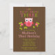 Enfie sua terceira festa de aniversário fora do direito com nossos convites de festas cor-de-rosa & vermelhos adoráveis do aniversário de criança da coruja. Aperfeiçoe o convite para sua celebração do partido de aniversário de 3 anos! Nossos convites da coruja do doce caracterizam uma coruja pequena bonito que senta-se em um ramo de árvore verde da folha com flores e são ajustados em um fundo marrom à moda. Nosso convite da festa de aniversario de meninas da coruja caracteriza um fundo original do teste padrão da coruja. Visite nossa loja para o obrigado de harmonização você cartões de nota, etiquetas do aniversário, obrigado etiquetas e selos postais. © pequeno Tatti