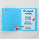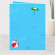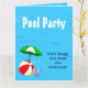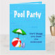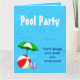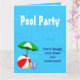 Convites de festas personalizados com um tema de piscina de natação divertida, decorados com uma bola vermelha de praia, guarda-chuva verde, sandálias e óleo de bronzeado em um fundo azul-d'água com ondas encaracoladas. Personalize-o para alterar fontes ou cores, até mesmo salve seu design para mais tarde.