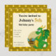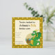 A impressão de aniversário convida com a ilustração de um dragão verde guardando um tesouro, sobre um padrão amarelo sem costura com estrelas; adequado para rapazes e raparigas