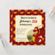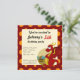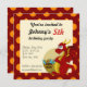 A impressão de aniversário convida com a ilustração de um dragão vermelho guardando um tesouro. Ilustrada por Maxi Harmony