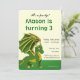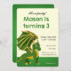 A impressão de aniversário convida com ilustração de um dragão verde giro. convite de aniversário fantasia temido ilustrado por Maxi Harmony