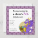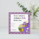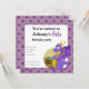A impressão de aniversário convida com a ilustração de um dragão roxo guardando um tesouro, sobre um padrão roxo sem costura com estrelas; adequado para rapazes e raparigas