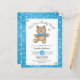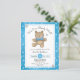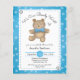 Convite de chá de bebê com design de arte digitalmente colorida e desenhada à mão do ursinho de pelúcia. Elementos pintados por Valarie Wade. Perfeito para qualquer época do ano. Texto ajustável. Ursinho de pelúcia com bolinhas azuis tema é menino. Clássico