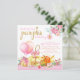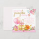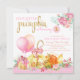 Convites de primeiro aniversário da pequena abóbora menina com lindas abóboras e balões rosa, laranja e dourado em um fundo de bolinhas florais rosa com texto fofo rosa e dourado. Você pode personalizar facilmente este convite de aniversário da pequena abóbora para o seu evento simplesmente adicionando seus detalhes. Este é um design impresso sem papel alumínio real, laços, etc.