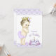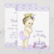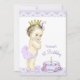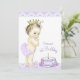 Convite de primeiro aniversário em lavanda e dourado com adorável princesa vintage usando calças de babado lavanda e coroa dourada em um lindo fundo de lavanda e renda e bolo de aniversário. Este convite de festa de aniversário lavanda é facilmente personalizado para o seu evento adicionando detalhes do evento, estilo de fonte, tamanho e cor da fonte e texto.