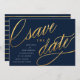 Estes convites de save the date exclusivos e modernos apresentam letra fancy em um efeito de folha de ouro falso em um fundo azul marinho escuro, com os detalhes do anúncio do casamento em branco. O verso apresenta um padrão de listras de azul marinho e dourado trendy. Altere a cor do fundo usando a ferramenta "Personalizar"!