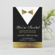Convites de smoking em preto e ouro para sua festa de janto formal ou evento formal especial! Elegante e mínimo em estilo design, este convite personalizado trará um toque elegante... A ilustração na frente mostra o traje formal do smoking de um homem, e o bar de destaque inferior pode ser facilmente excluído se você preferir mais espaço em preto para o texto personalizado. Você também pode remover os gráficos dourados na modelo para poder alterar a cor do arco com o seletor de fundo. Na parte de trás destas cartas está um "vestido preto" para as senhoras e um fio de pérolas.Cores: preto, ouro, ouro, branco.Categoria: festas formais, jantes, caso de gravata negra.