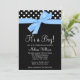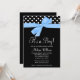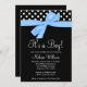 Um convite azul e preto à moda do chá de fraldas. Caracterizando bolinhas e um gráfico azul do arco. Aperfeiçoe para um chá de fraldas do rapaz pequeno. Na moda e bonito. Personalize facilmente para seu partido! O design é ilustrações/gráficos impressos plano - FITA NAO REAL.