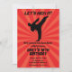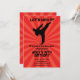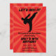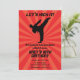 Vamos chuta! Este convite divertido apresenta um fundo vermelho de explosão de estrelas e uma figura de silhueta de pontapé de karatê. Perfeito para a festa de aniversário de karatê do seu filho.