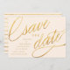 Estes convites modernos e únicos de salva a data apresentam uma fonte fancy com efeito de folha de ouro falso em um fundo doce de cor champanhe, com os detalhes do anúncio do casamento em branco. O verso apresenta um padrão de listras douradas trendy. Altere a cor do fundo usando a ferramenta "Personalizar"!