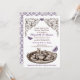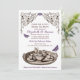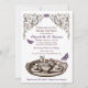 Os convites nupciais do tea party do jardim roxo caracterizam um grupo e borboletas de chá com um encabeçamento floral do rolo e padrões do ornamentado em roxo, em marrom, e o branco.
