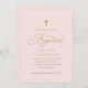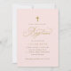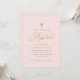 Convites para Batismo Elegante: Este convite para batismo de rosa claro apresenta um guião de ouro elegante e uma cruz simples, personalizada com o nome da sua filha e os detalhes do evento. Um design macio e eterno perfeito para uma celebração clássica do batismo de uma menina.