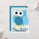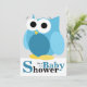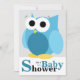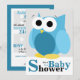 Convites de chuveiro para bebês de coruja dupla, em forma de coruja lateral, com uma coruja azul grande ilustrada na frente e os detalhes do chá na parte traseira. Outros produtos correspondentes disponíveis mediante pedido.