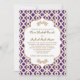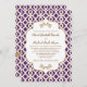 O elegante e belo azulejo marroquino francês inspirou convites para o casamento com uma matiz roxa repetitiva e um padrão geométrico de gola-de-ouro de design e flores florais douradas. Este convite de casamento de luxo e escala é perfeito para um casamento de marroquino, árabe ou aladino. A parte de trás desses convites personalizados, de quadros de rico e de olhares bonito e exóticos podem ser personalizados com a noiva e o monograma do noivo em breve casados e nomes na forma quatrefoil. Trabalho de arte e design © Chrissy H. Estúdios, LLC. Todos os direitos reservados.