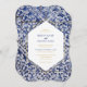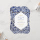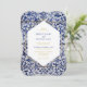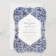 Este design apresenta padrões azulejos portugueses russos. O texto do casamento é elegantemente enquadrado com uma forma geométrica branca e dourada. Design de convite para casamento floral único Azulejo azul e branco com elementos modernos. Também estão disponíveis itens de papelaria de casamento e outros formatos de convite de casamento.