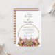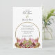 Esta design apresenta um buquê rústico de flores silvestres. Um simples círculo dourado circunda o texto enquanto os nomes da noiva e do noivo estão posicionados em cima. Os tons rústicos cor-de-rosa floral elogiam o verde das folhas. Os tons de ouro unem tudo para criar uma sensação rústica de jardim florestal rural. Ouro e listras cor-de-rosa cobrir a parte traseira do design. Design de convite para casamento elegante com elementos modernos. Também estão disponíveis itens de papelaria de casamento e outros formatos de convite de casamento.