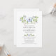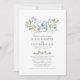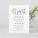 Convite de casamento azul de cor aquosa com flores pintadas manualmente e folhas pequenas.