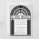 Um convite clássico e casamento vintage mostrado aqui em negrito preto e branco com bordas de cinza. Um gráfico estilizado de Art Deco que incorpora uma explosão solar, uma estrutura e um painel alto decoram esta design impressionante e uma silhueta de uma noiva e seu noivo completam a imagem. Qualquer cor de fundo pode ser escolhida para este design, selecionando a opção "personalizar" e, em seguida, "Editar", "Fundo". Art Deco era um estilo popular no 1920, nos anos 1930 e 40.