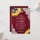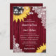 Este convite floral de casamento com girassóis contra um fundo de madeira de celeiro enfeitado com luzes de cordas e rendas florais brancas é perfeito para convidar seus convidados para sua festa de casamento vermelha rustica inspirada por girassóis. Fácil de personalizar modelo. design totalmente personalizável.
