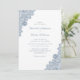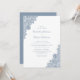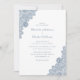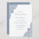 Estes elegantes convites de casamento de rendas com rendas azuis empoeiradas num fundo branco comum são perfeitos para convidar os seus convidados para a sua festa de casamento romântica rústica e empoeirada. Fácil de personalizar a modelo.
