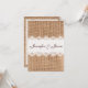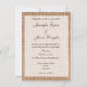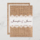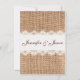 Rustic Country Burlap Wedding Invtions com uma faixa de renda impressa e o nome da noiva e noiva que o atravessa está em um dos lados deste convite para casamento. O outro lado também tem o fundo do impressão da sobreposição e os detalhes do convite para casamento estão em cima de uma camada branca transparente para que você possa ler o texto mais facilmente. O texto é marrom. Se você quiser mudar as cores da fonte ou mover as coisas, use o botão "Personalizar".