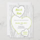 Este convite rústico apresenta um conjunto de 3 corações sobre um design de grão de cinza. O padrão opcional de grãos de madeira no verso pode ser deixado como está ou excluído durante a personalização. Todos os tipos de letra e o tipo de letra podem ser personalizados, bem como as cores da fonte. Também estão disponíveis cartões rsvp correspondentes e outros itens.