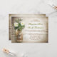 belos convites de casamento rústicos com fundo de madeira em apuros e jarro de pedras com flores brancas. Eu sugiro um belo papel de textura de linho para este design.