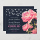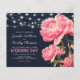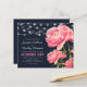 Convites baratos de casamento vintage com fundo azul, lindas flores cor-de-rosa-verão, luzes de cordas e um modelo de casamento na moda que é fácil de personalizar.