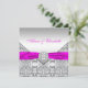 O convite para casamento Elegante de prata de diamante e fuchsia com fita fuchsia bonito com centro de diamante em um fundo de renda prateada. Esses belos convites fuchsia e prata são facilmente personalizados para seu evento simplesmente adicionando seus detalhes no estilo de fonte que você prefere. Esta é uma design impressa sem fitas reais, joias, rendas, etc.