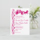 Estes convites para casamentos vintage têm um elegante design de carruagem desenhado com um coração no lado da porta da carruagem. Também tem elegantes flores florescentes e videiras que fluem pelo lado esquerdo do convite. O cavalo, a carruagem e a design florescente é uma cor rosa-quente de fuchsia magenta. A parte de trás do convite também tem o cavalo e a massa na parte inferior do convite com florescimento em ambos os lados.