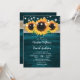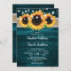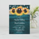 Este convite de casamento rústico e teal que apresenta girassol contra uma pá e um fundo de madeira de celeiro é perfeito para convidar seus convidados para sua festa de casamento rústica teal inspirada pelas flores de girassol. Fácil de personalizar a modelo.