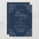 Este convite de casamento azul-marinho recentemente atualizado é elegante e elegante. Ele apresenta os cantos de vintage do ornamentado com a caligrafia vintage. Ele tem o aspecto de impressão branca no estoque de marinho azul. É perfeito para um casamento elegante e elegante.