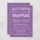 Coma, beba, e seja casado — convites de casamento rústicos de campo, estilo Vintage — Rolamentos roxos, encaracolados e tipografia de moda antiga em um fundo alegre e radiante de roquídea lilac roxo. Adicione seus nomes e informações de casamento neste modelo fácil de usar. O elegante, mas divertido e caprichoso, escrevendo de script de estilo chalkboard pode ser modificado para o seu tema de casamento formal ou semiformal. O estilo moderno casual é perfeito para casamentos contemporâneos modernos, com um toque divertido de encanto sofisticado para a noiva e noivo tradicionais. Entre em contato conosco para obter ajuda com a personalização se precisar de espaço adicional para os detalhes do casamento. Outros tamanhos e estilos de quadro disponíveis.