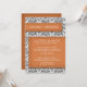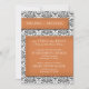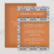 Trendy e convites modernos para seu casamento. Apresenta uma design/ilustração com costura laranja sobre uma cor damasco preta e branca. Informações, instruções ou detalhes adicionais podem ser impressos no verso (opcional).