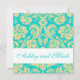 Estes elegantes convites para Casamentos tema damasco de Aqua Cream têm os nomes da noiva e do noivo na frente, em uma faixa branca e um convite formal para casamento na parte de trás. Elke Clarke ©2012. Use os prompts ou selecione "personalizar" para opções de edição de cheio.