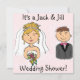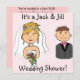 Estes adoráveis convites para Chás de casamento Jack & Jill apresentam uma noiva de desenho animado e um noivo. A noiva é esfolada num vestido branco sem espuma com um véu e colar de pérolas. Ela está segurando seu buquê de flor misto. Groom está vestindo seu smoking de cinza escura com lapelas pretas, camisa de rosa claro e gravata de arco rosa para combinar com seu buquê de noivas. Esta noiva e noiva de desenho animado estão entre um fundo rosa. O texto na frente diz que é um Chá de casamento Jack & Jill, no entanto, isso pode ser personalizado para atender às suas necessidades. O verso é rosa claro com texto preto que também pode ser personalizado. Esses convites para chás de casamento são perfeitos para chás de casamento de tomada e de chá de panela, ou podem ser usados para convites de festa de solteira ou tradicionais.