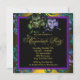Lindo convite de festa de máscaras preto, dourado, verde e roxo apresenta uma máscara verde de Mardi Gras veneziano, uma máscara roxa de Mardi Gras veneziano e espirais elegantes em azul-teal e roxo. Este convite de festa de máscaras de Mardi Gras com cores tradicionais funciona bem para convite de festa de máscaras de sweet sixteen, convite de festa de máscaras de Quinceanera roxo, convite de aniversário de máscaras para mulheres, convite de festa de Mardi Gras roxo e dourado, convites de festa de Carnaval, convite de baile de máscaras, e qualquer outra festa ou evento de máscaras roxas e é facilmente personalizado simplesmente escolhendo o botão "Personalize!" para começar a adicionar os detalhes do seu evento, estilo de fonte, tamanho e cor da fonte e texto. Por favor, note que todos os cartões e convites que você encontrará no Zazzle são gráficos impress