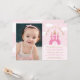Convites de aniversário de princesa personalizados com a foto da aniversariante. Um castelo de princesa rosa e dourada com "Era uma vez, numa terra distante..." e o nome da princesa e a idade que ela está a imprimir abaixo, juntamente com todos os detalhes da festa. Um confete rosa e branco divertido cai do céu em comemoração do aniversário da princesa! Nota: Os elementos Dourados terão a impressão de se parecerem com ouro brilhante, mas não será utilizada qualquer brilho real no produto final.