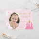 Convites de aniversário de princesa personalizados com a foto da aniversariante. Um castelo de princesa rosa e dourada com confete caindo pelo ar! O convite diz: "Era uma vez... A Princesa Blair estava fazendo quatro anos!" e todos os detalhes da festa. Personalize com a foto, o nome e os detalhes da festa de aniversário da sua filha! Um confete rosa e branco divertido cai do céu em comemoração do aniversário da princesa! O backer tem um monograma de script para seu nome, tocado com uma ouro princesa coroa. Nota: Os elementos Dourados terão a impressão de se parecerem com ouro brilhante, mas não será utilizada qualquer brilho real no produto final.