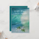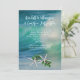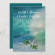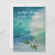 Modelo de convite para casamentos cruzados com fundo oceânico e estrelas-do-mar com design holly. Convidar convidados para um casamento de dezembro no alto mar usando este modelo com texto azul pálido em forma de parágrafo. Mude a redação e adicione espaços para um casamento de Natal sem terra. Os nomes do casal estão no topo em um script grande e manuscrito. Duas estrelas-do-mar brancas são embrulhadas em verde e oco no fundo. Também comprar como um download instantâneo para compartilhar on-line.